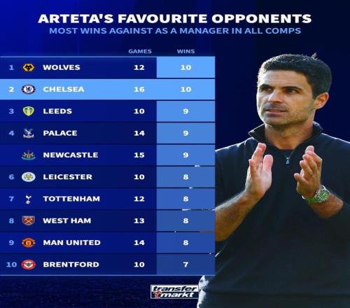 根據德國足球轉會市場的最新統計,阿森納主帥阿爾特塔在執教生涯中,麵對切爾西取得了16場10勝的戰績,這是他贏球次數最多的對手,與狼隊並列勝場榜首位。