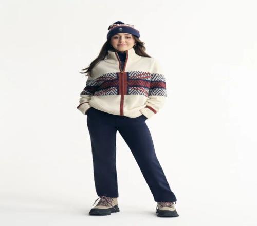 開幕式製服采用冬季白色係羊毛大衣,搭配繡有美國國旗圖案的針織毛衣、對比色細節與優雅剪裁,整體呈現出一種「優雅複古滑雪風」。
