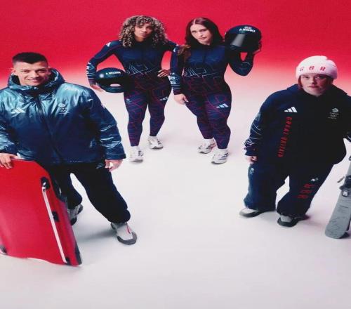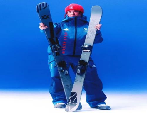 Adidas 負責競技裝備與功能結構,將英國國旗 Union Jack 圖案進行結構性解構,使其融入冬季運動服廓形之中,而非簡單的平麵印花。色塊拚接與幾何切割讓視覺更具速度感,也強化了競技氛圍。