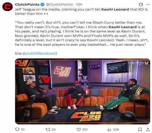 前NBA球員傑夫-蒂格也談到了倫納德本賽季的表現,他表示:你們不能說凱文-杜蘭特比倫納德更強。倫納德處於巔峰狀態且健康時,我認為他的水平跟杜蘭特是一致的,雖然杜蘭特贏得了MVP與FMVP,所以確實有一點差距,但說倫納德不比他差也不算離譜。我是說,他真的是NBA曆史上最頂級的球員之一…… 就是老不打比賽。