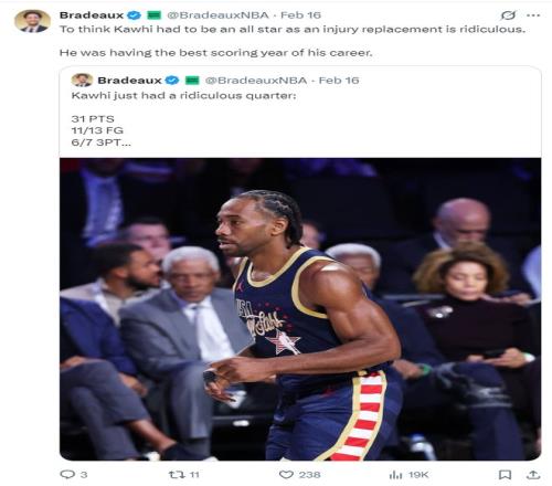 休媒Bradeaux寫道:要說倫納德能在全明星沒上受傷的情況下進入那太荒謬了。不過他這一年在得分方麵的確極為出色,這是他職業生涯最出色的一個賽季。