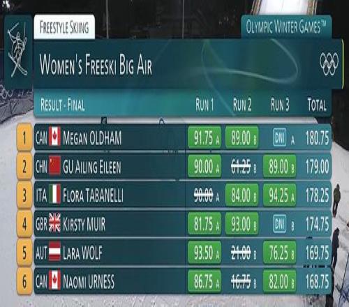 隨著英國選手繆爾並未選擇提升自己的A類動作,並且在B類動作中出現失誤,中國選手穀愛淩就此獲得本屆米蘭冬奧會自由式滑雪女子大跳台的銀牌。
