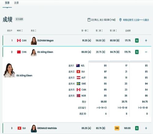 最後一跳,穀愛淩在B類動作完成1260!拿到89.00的同時,決賽總得分定格在了179分!這一得分逼近180分,表現相當出色。盡管此後塔巴內利完成了驚豔世人的1620,拿到了超高的94.25分,但依舊以0.75分之差排在穀愛淩身後。