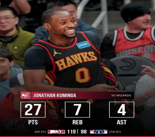 迎來老鷹生涯首秀的庫明加表現十分搶眼,替補出戰約24分鍾,投籃12中9,其中三分4中3,罰球7中6無比高效砍下27分外加7板4助2斷全麵數據,正負值+16,幫助新東家119-98輕鬆擊敗奇才。